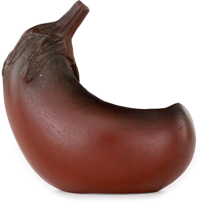 75 x 50 x 77 mm | Hersteller: Bigei | Herkunft: Tokoname, Japan | Merkmale: Ovaler, handgefertigter, unglasierter Bonsai-Topf in Auberginenform