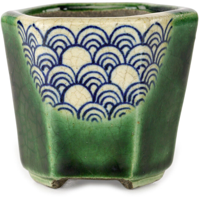 71 x 71 x 62 mm | Hersteller: Terahata Satomi Mazan | Herkunft: Tokoname, Japan | Eigenschaften: Sechseckiger handgefertigter grüner Bonsai-Topf von Terahata und Satomi Mazan