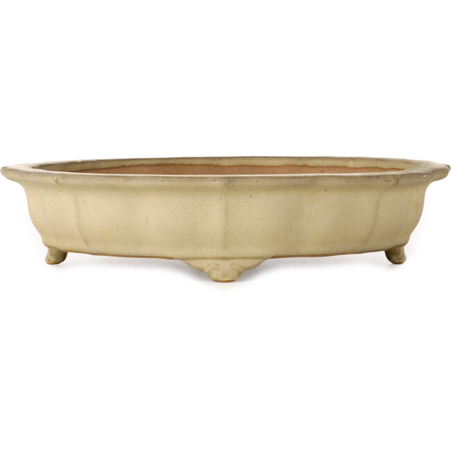 Handgefertigter, cremefarbener Lotus-Topf mit einer kleinen Absplitterung am inneren Rand.