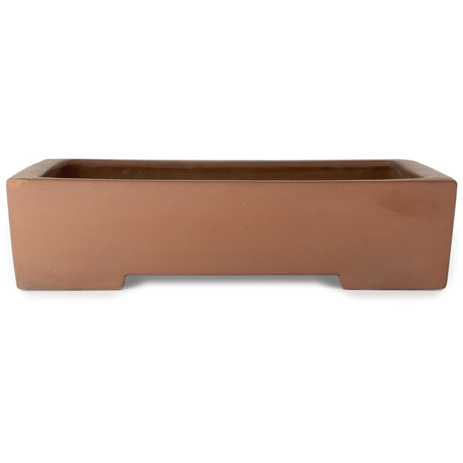 Rechteckiger, handgefertigter, unglasierter Topf mit einer abgeplatzten Ecke.