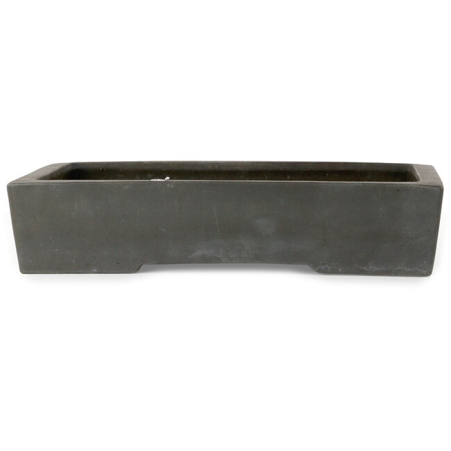 Rechteckiger, handgefertigter, unglasierter Topf mit einer kleinen Absplitterung am Boden eines Fußes.