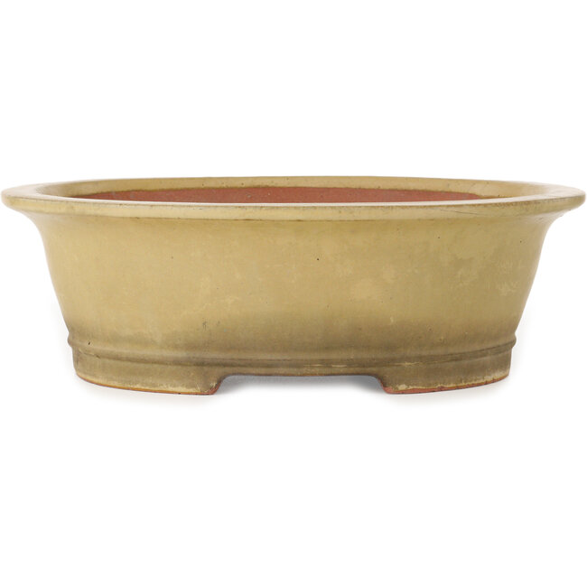 Ovaler, handgefertigter, cremefarbener Topf mit mehreren Absplitterungen am Fuß, hergestellt von der ersten Generation