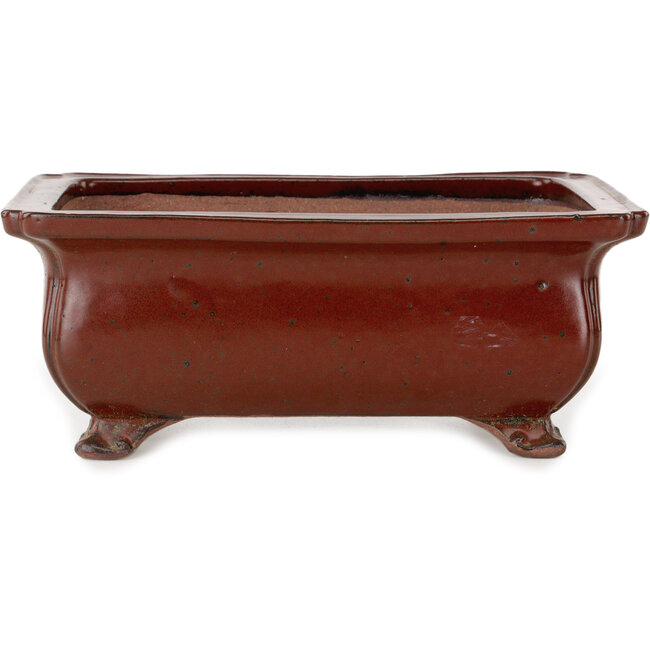 250 x 183 x 98 mm | Hersteller: Seizan (Reihou, Kataoka Katsushi, Meister des Seizan-Ofens) | Herkunft: Tokoname, Japan | Eigenschaften: Rechteckiger, handgefertigter roter Bonsaitopf