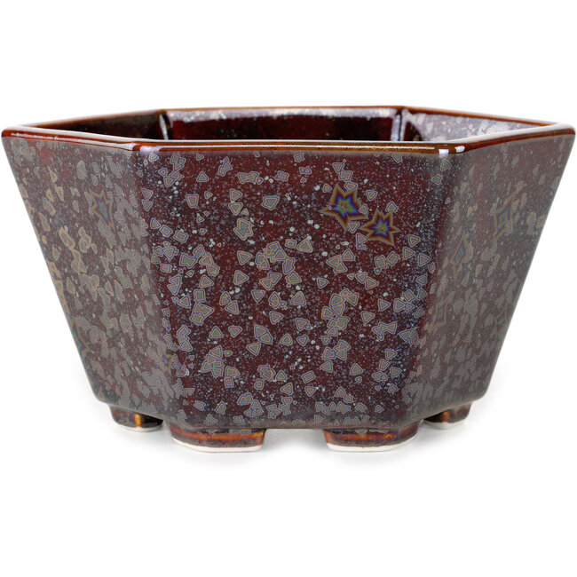 Hexagonal brown metallic, crystal glaze bonsai pot by Heian Senzan - 140 x 140 x 75 mm