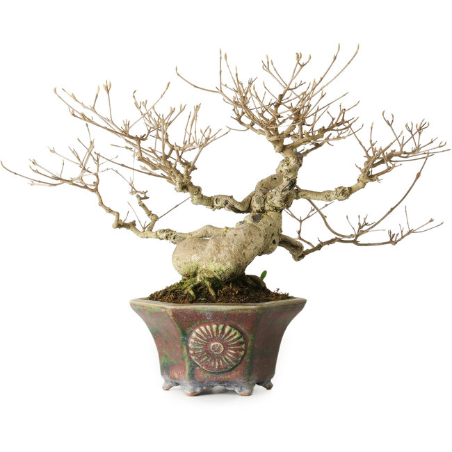 - Otras características: con sus hermosas bayas de color púrpura en otoño y buena ramificación y ahusamiento, y un nebari de 8 cm, en una maceta japonesa hecha a mano por Heian Kosen.