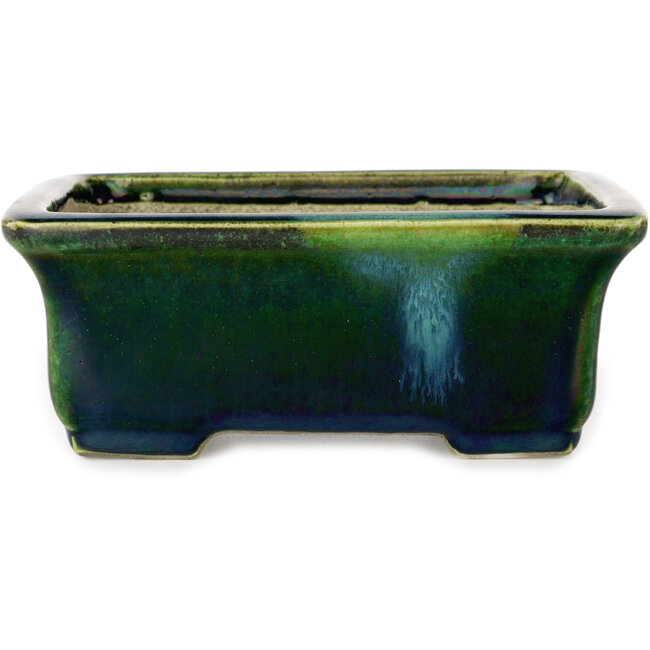 165x135x65mm | Creador: Terahata Satomi Mazan | Origen: Tokoname, Japón | Características: Maceta rectangular hecha a mano de color verde con detalles en azul para bonsái hecha por Terahata y Satomi Mazan. Leer más.