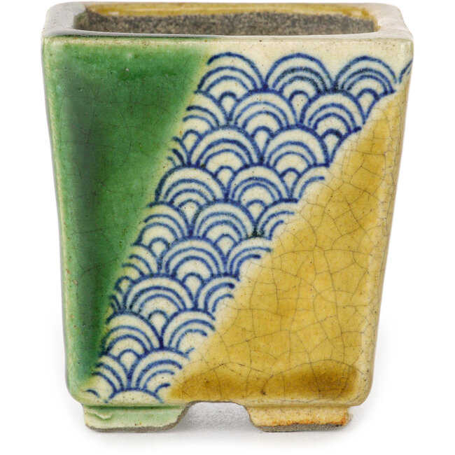 Maceta cuadrada para bonsái verde y amarilla de Terahata Satomi Mazan - 63 x 63 x 68 mm