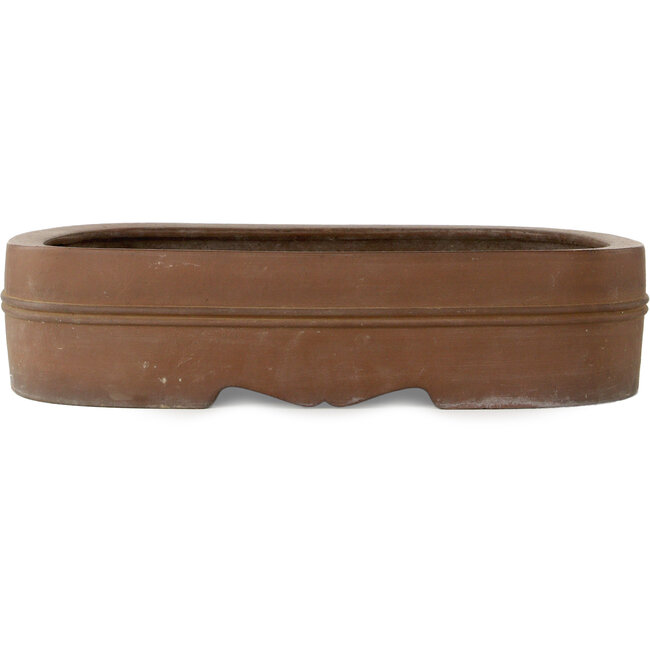 Olla ovalada hecha a mano sin esmaltar con un pequeño desprendimiento en el exterior del borde.