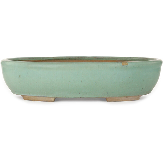 442 x 375 x 103 mm | Fabricant : Inconnu | Origine : Chine | Caractéristiques : Pot à bonsaï ovale vert fait main, présentant un éclat sur le bord.