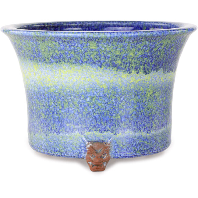 225 x 225 x 150 mm | Fabricant : Shuhou | Origine : Tokoname, Japon | Caractéristiques : Pot à bonsaï rond, bleu et jaune, fait main, avec pieds en forme de tête de démon