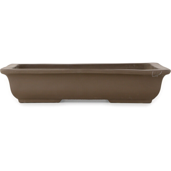 Pot rectangulaire fait main non émaillé avec une fissure superficielle sur le bord, due au processus de cuisson.