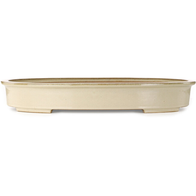 Pot ovale blanc cassé fait main, présentant une petite fissure superficielle sur le bord.