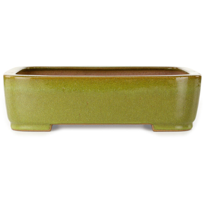 317x230x87mm | Fabricant : Seizan (Reihou, Kataoka Katsushi, maître du four Seizan) | Origine : Tokoname, Japon | Caractéristiques : Pot à bonsaï rectangulaire fait main vert citron