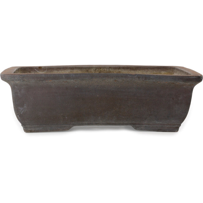 565 x 425 x 163 mm | Fabricant : Inconnu | Origine : Japon | Caractéristiques : Pot à bonsaï rectangulaire fait main, non émaillé, présentant de nombreux éclats sur le bord.