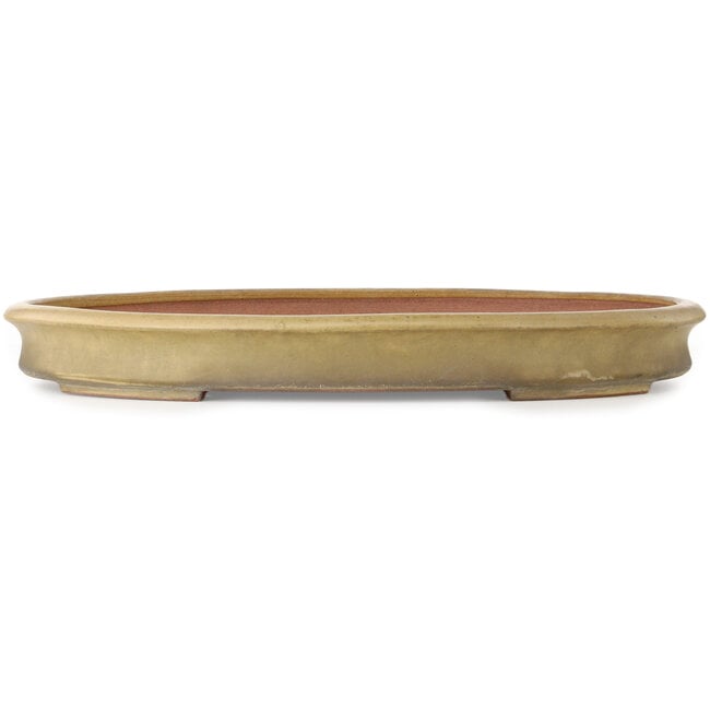 Pot ovale beige fait main, avec un éclat sur un des pieds.
