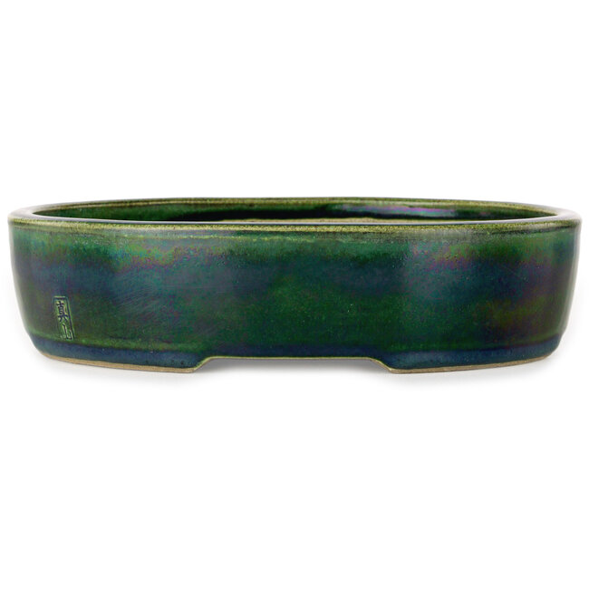 222 x 175 x 52 mm| Autore: Terahata Satomi Mazan | Origine: Tokoname, Giappone | Caratteristiche: Vaso bonsai verde ovale fatto a mano realizzato da Terahata Mazan
