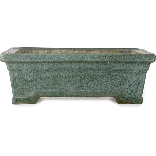 435 x 325 x 140 mm | Produttore: Sconosciuto | Origine: Giappone | Caratteristiche: Vaso bonsai rettangolare verde fatto a mano con più scheggiature sul bordo e sui piedi