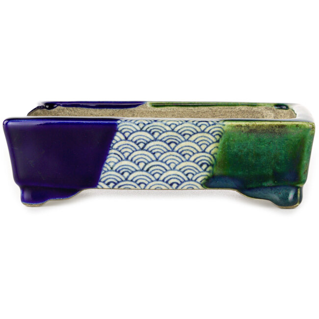 150 x 108 x 43 mm | Maker: Terahata Satomi Mazan | Herkomst: Tokoname, Japan | Kenmerken: Rechthoekige handgemaakte blauwe en groene bonsaipot gemaakt door Terahata en Satomi Mazan