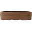 Ovale, handgemaakte, ongeglazuurde pot met een klein chipje aan de buitenrand.